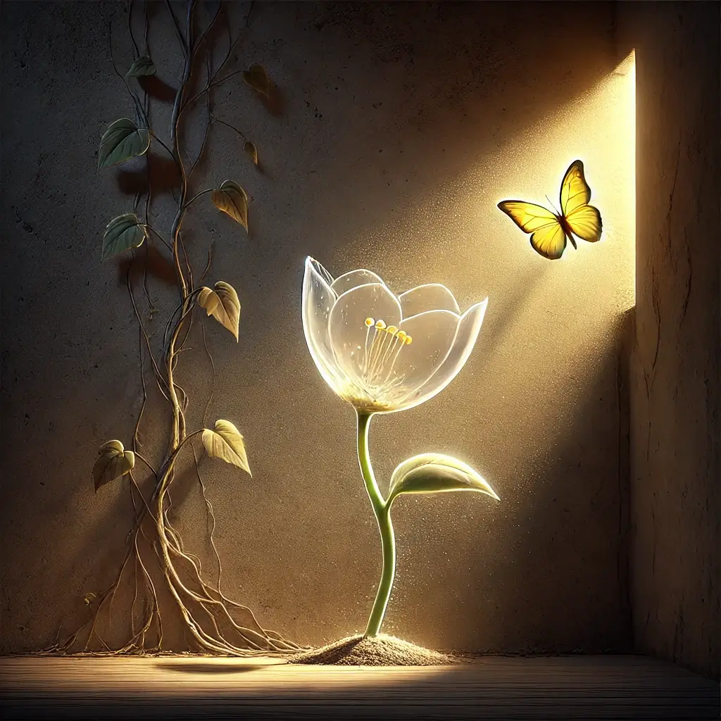 태양꽃은 이야기 초반에 투명한 꽃을 피웁니다. 이 꽃은 처음에는 다른 존재들에게 보이지 않으며, 이는 자신의 가치를 스스로도 인식하지 못한 상태를 상징합니다. 투명한 꽃은 우리 삶에서 타인의 시선과 평가에 의존하는 모습을 비유적으로 보여주며, 아직 자아를 확립하지 못한 주인공의 불완전한 상태를 나타냅니다.